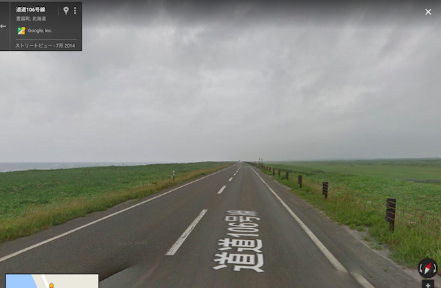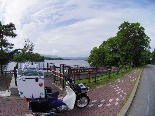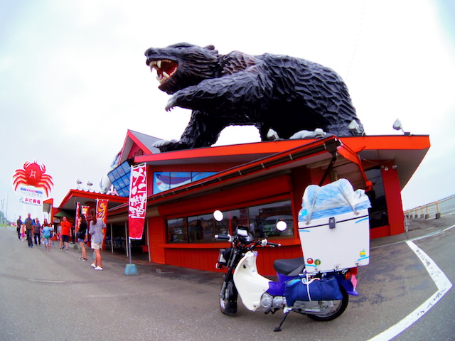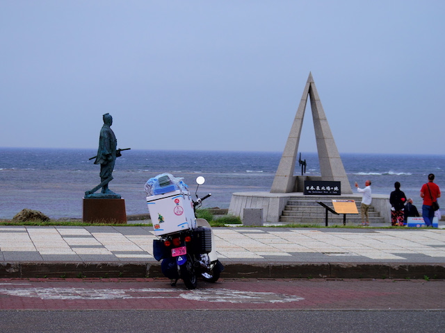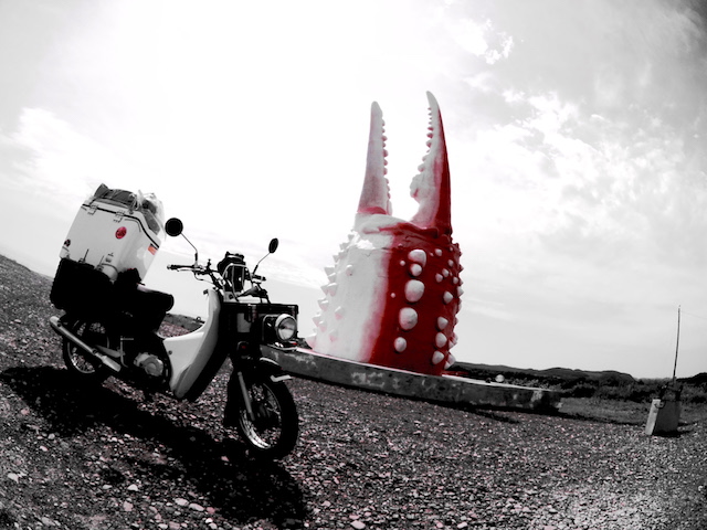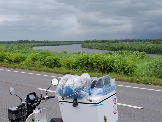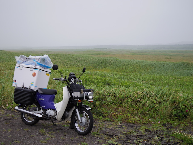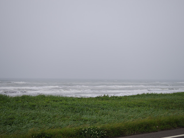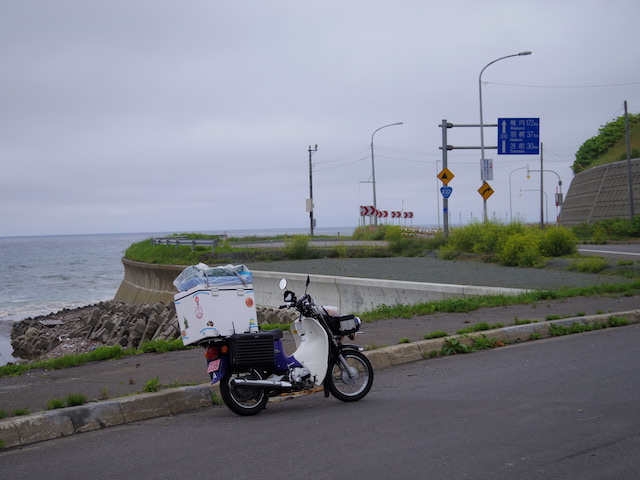 牧場の風景とオホーツク海を眺めながらのんびりツーリングが続くと思っていたら、甘かった。今回のツーリングで最大の試練が待っていた。横風である。今日、オホーツク海沿岸には強風注意報が出ていたが、風を遮るものがない真っ直ぐな道を走っている時、内陸から海に向かって吹く風が急に強くなった。荷台のボックスの上にマットや寝袋をくくりつけたカブの側面に容赦無く吹きつける。まっすぐ進むには車体を風上に傾け、ハンドルを逆にねじる。かぜの強さにも強弱があるのでヨロヨロ運転になる。時おり抜いていく大型トラックからは危なっかしく見えたに違いない。さらに風が強くなり危険を感じて、とうとうカブを押して歩いた。風を遮るものがあればと前方を見てもそれらしいものはない。強風は1時間ぐらいで弱まったが、心臓がドキドキした1時間であった。
