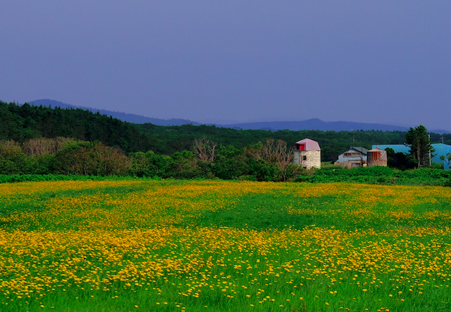 さて、午前7時30分、荷物を積み終えキャンプ場を後にする。国道238号を紋別、サロマ湖に向かって走る。1時間ほど原野と牧草地の単調な道を走ると、枝幸町から雄武町に入った。このあたりは大規模な牧場が目につく。そんな中、一面の牧草地に黄色い花が咲き乱れている牧場があった。思わず足を止めてカメラを出した。さらに走ると今度は、刈り取った牧草をロール状にラッピングした「牧草ロール」が運動会の大玉転がしのようにゴロゴロとある。